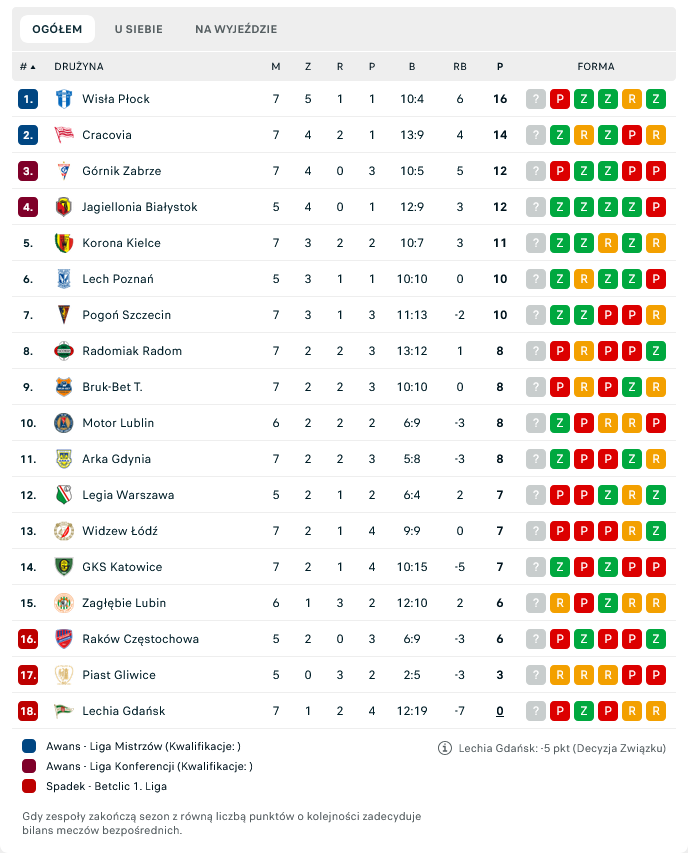 Komplet wyników i tabela po 7 kolejce PKO BP Ekstraklasy